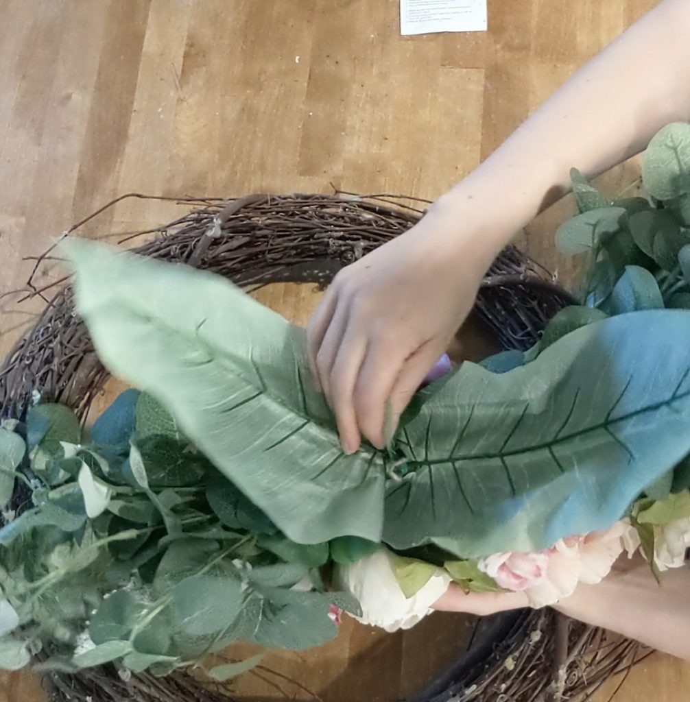 It has a couple of big green leaves on the back, maybe to make it easier to attach to a door frame. I didn’t want those visible on my wreath, so I just quickly removed them by sliding those stems out of the bundle of arranged florals.