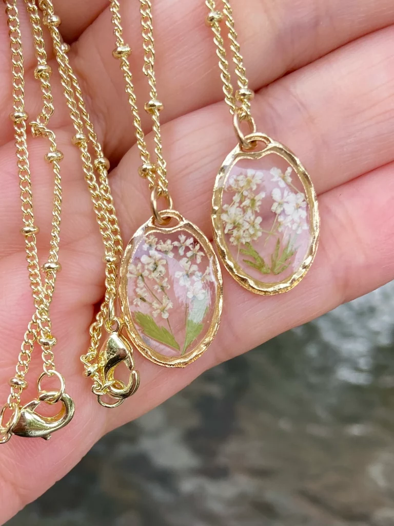 With this you wear one of the most beautiful and misunderstood flowers, this Queen Anne’s Lace Necklace holds a symbol of everything we love about her, preserved in a beautiful way.