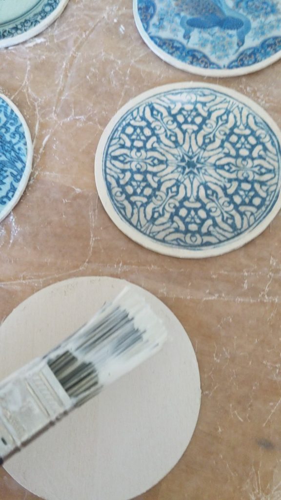 Once the wood circles are dry, brush the modpodge lightly on each wood round. Then, place the printables over top, gently nudging them into place.