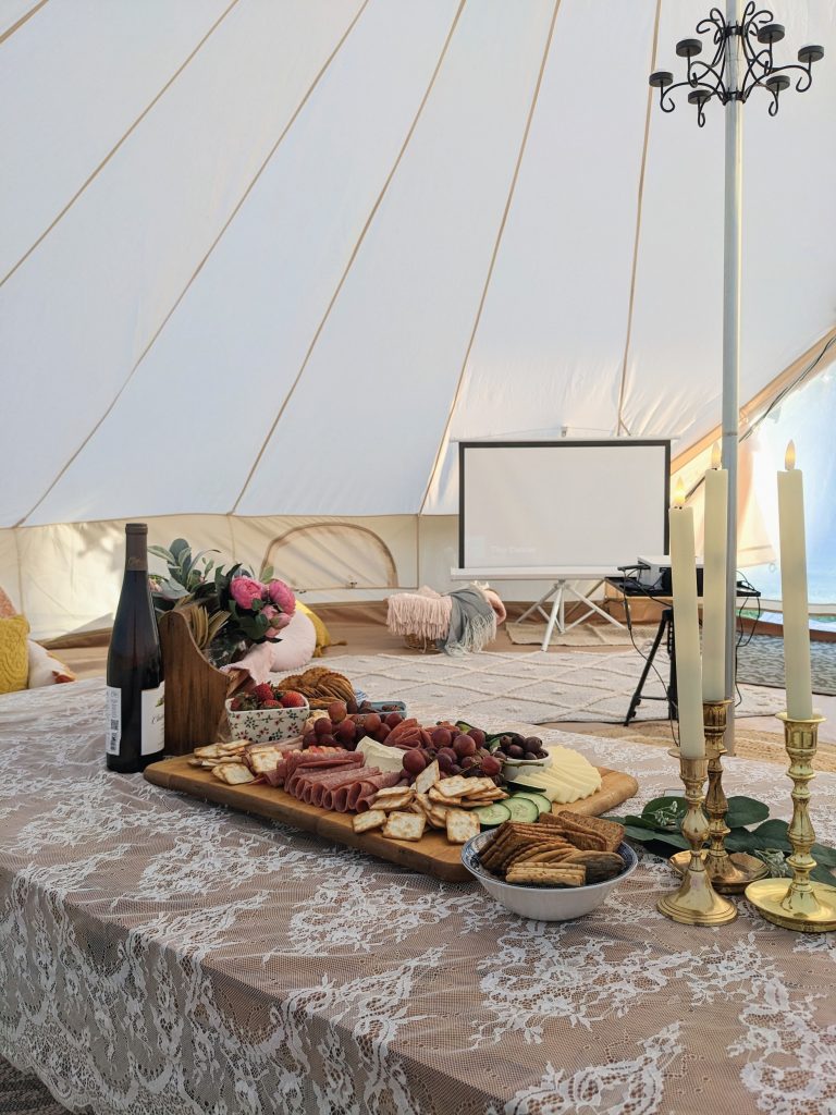 A movie projector is always a huge hit for a cozy glamping night. Mini projectors can be as little as $20, and can be projected right onto the tall ceiling of the tent, no screen necessary!