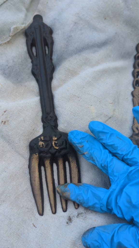 I decided to try it on both the Goodwill art frame and the cast-iron spoon and fork I had hanging on this wall.