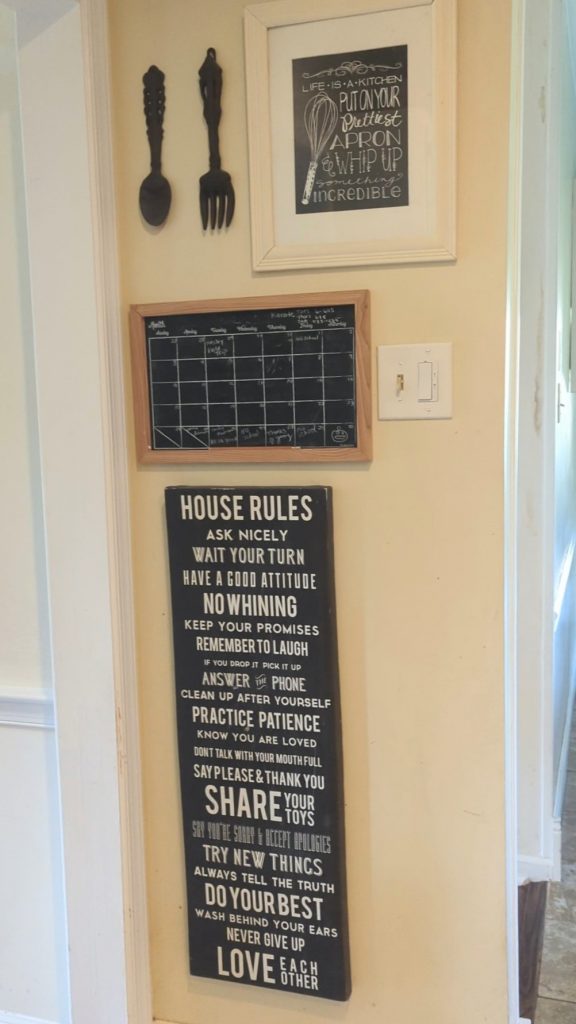 To complete the update, I swapped out our old “house rules” sign for the new DIY chalkboard, and added the refreshed $3 artwork along with an affordable find from Hobby Lobby! Finally, I treated the wall to a new antique-style light switch cover I found on Amazon. I love these covers because they offer every configuration imaginable, even a really odd one like mine!