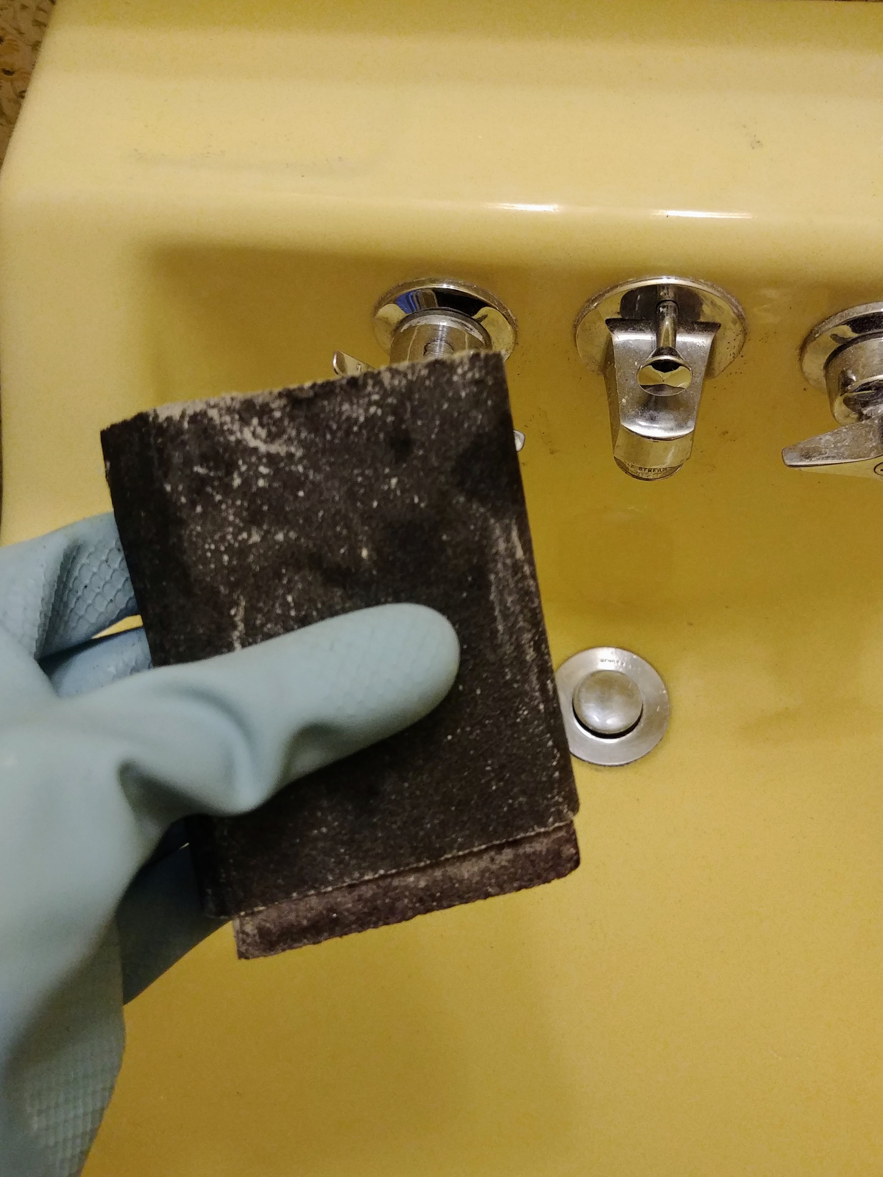 sanding the sink before painting with Rustoleum tub and tile paint kit