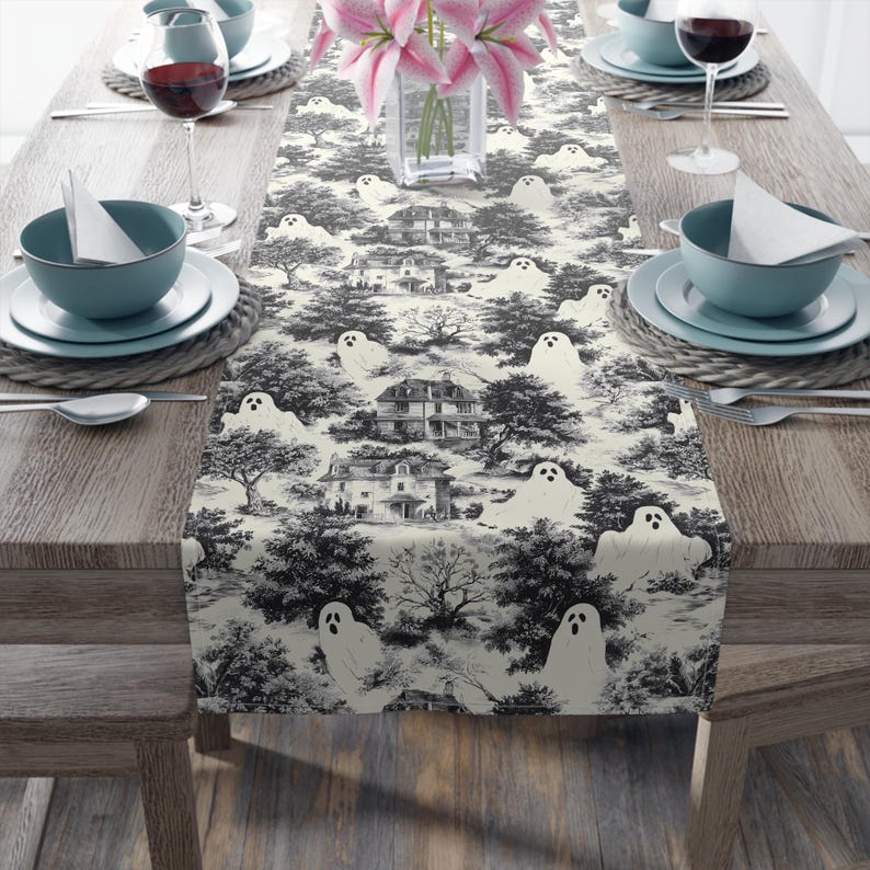Table runners are compact, and an easy seasonal switch. Going with the classic meets halloween, this toile runner is beautifully subtle, and easy to swap out for the next season!
