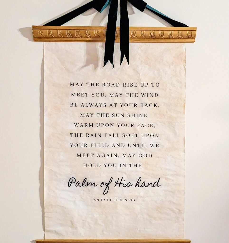 Hubs really loves the Irish Blessing, so I had this poster made with an engineering print from Staples. When I got it home, I was not loving the bright white paper, and wanted to give it a vintage patina.