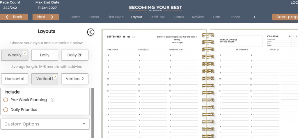 After selecting the cover, you can pick a weekly or daily layout and start customizing placement.